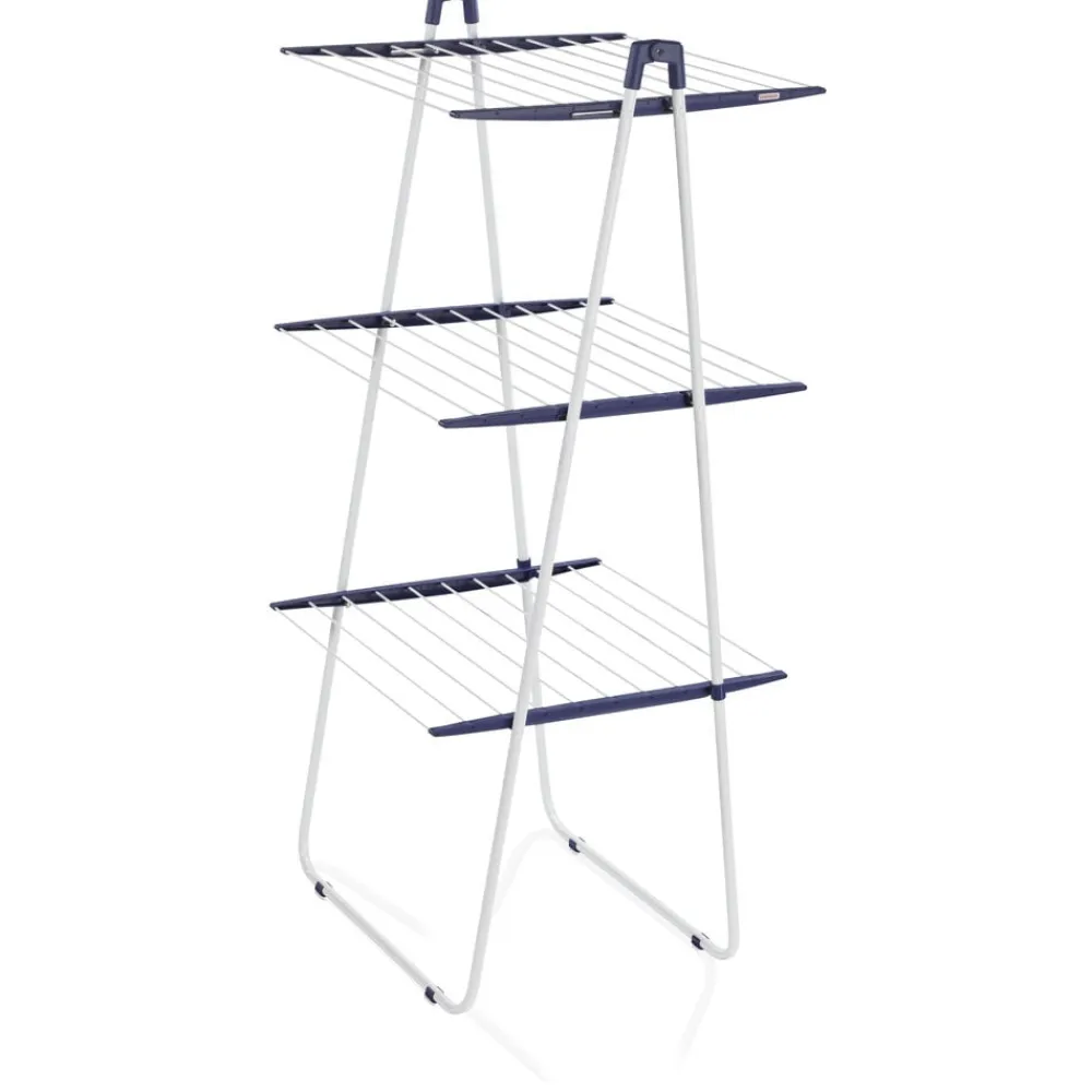 Stort tørrestativ, som kun tager lidt plads, men har 19 meter tørreplads til hele to maskinfulde tøj ad gangen. Midterste niveau kan foldes sammen, så det er nemt at tørre fx lange bukser og kjoler. Stativet har to sokkeholdere og foldes nemt sammen.