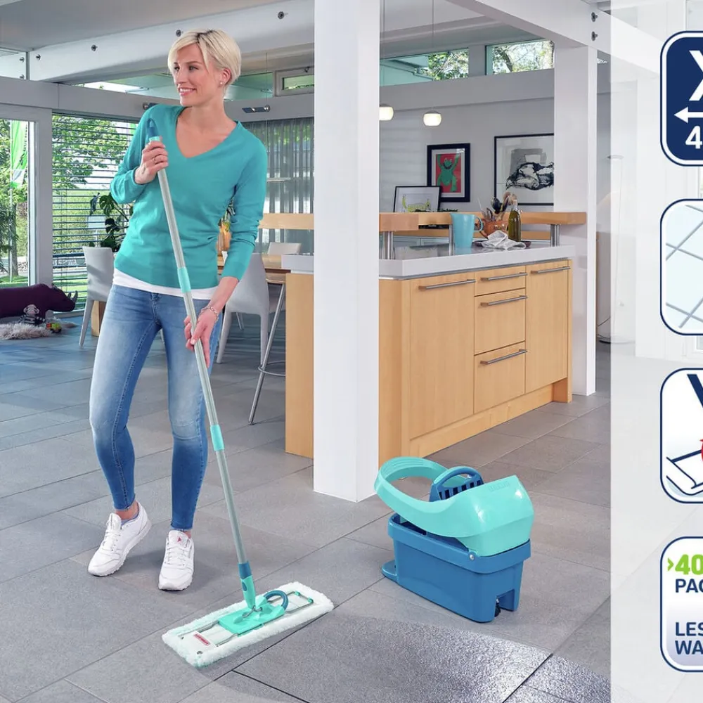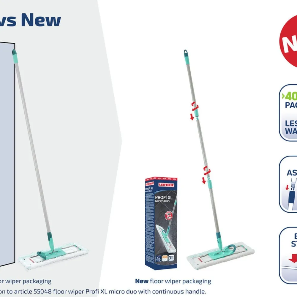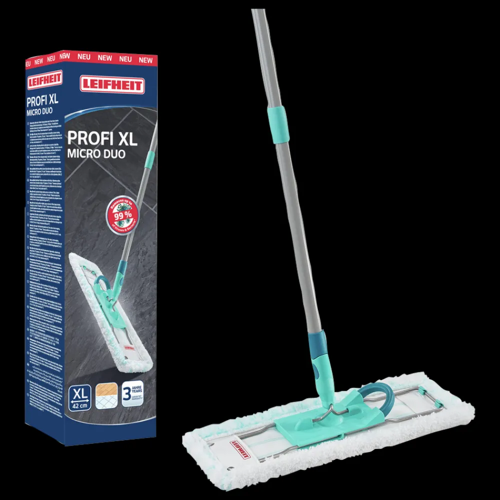 Den ideelle gulvvasker til grundig rengøring af alle gulvtyper. Leifheit Profi Micro Duo fjerner genstridigt snavs og renser fodlister på samme tid med sit specielle dobbelte fibercover. Med det fleksible 360 graders rotationssystem kan du gøre effektivt rent i bølgede linjer, og aftørringsbredden på 42 cm sparer meget arbejde. Håndtaget kan vinkles fladt.