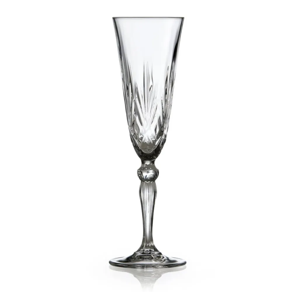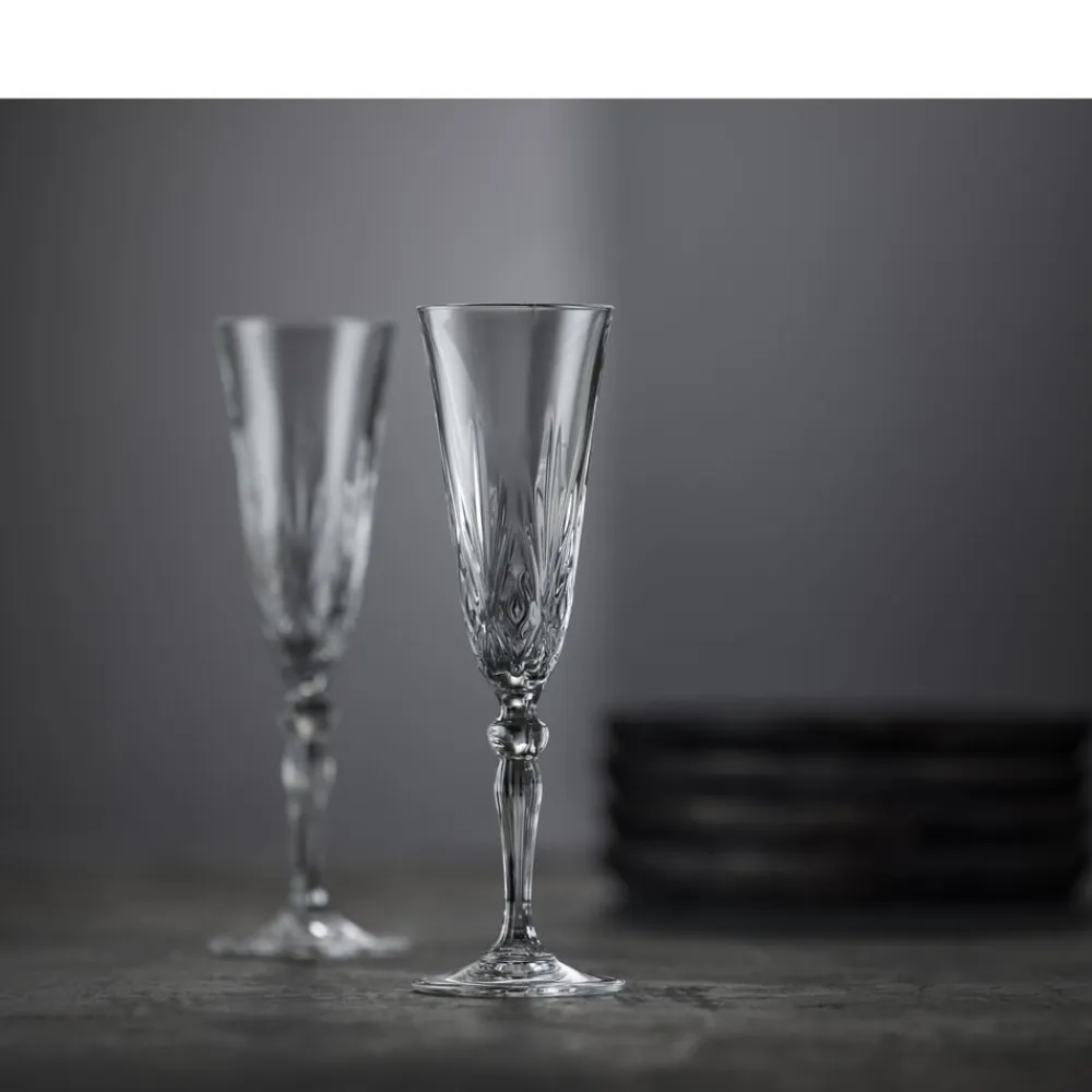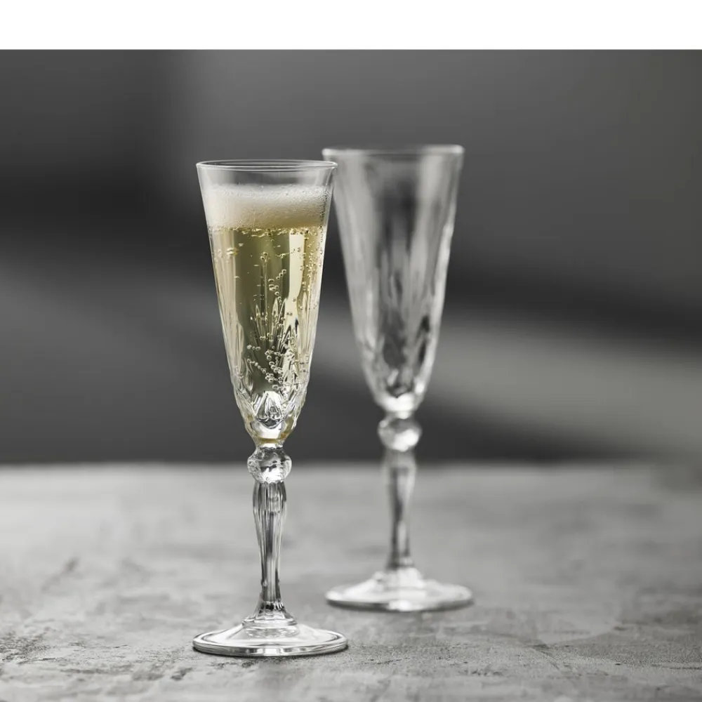 Champagneglasset fremhæver sit perlende indhold på smukkeste vis, når glassets elegante mønster reflekterer omgivelsernes skygger. Tåler opvaskemaskine. 16 cl, højde 22 cm, 4 stk.