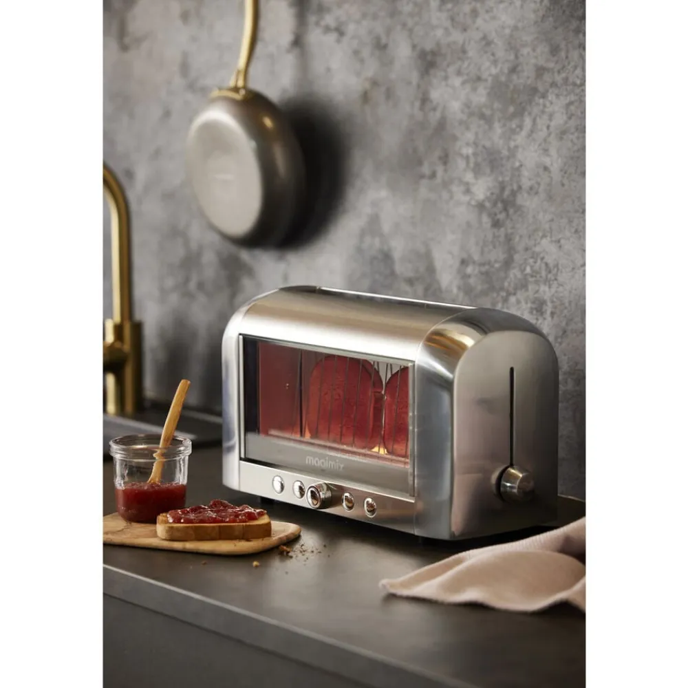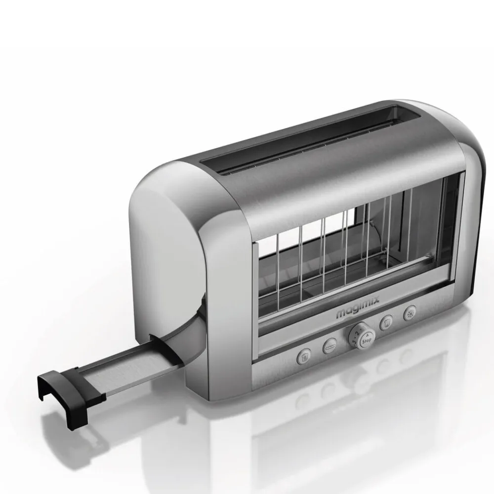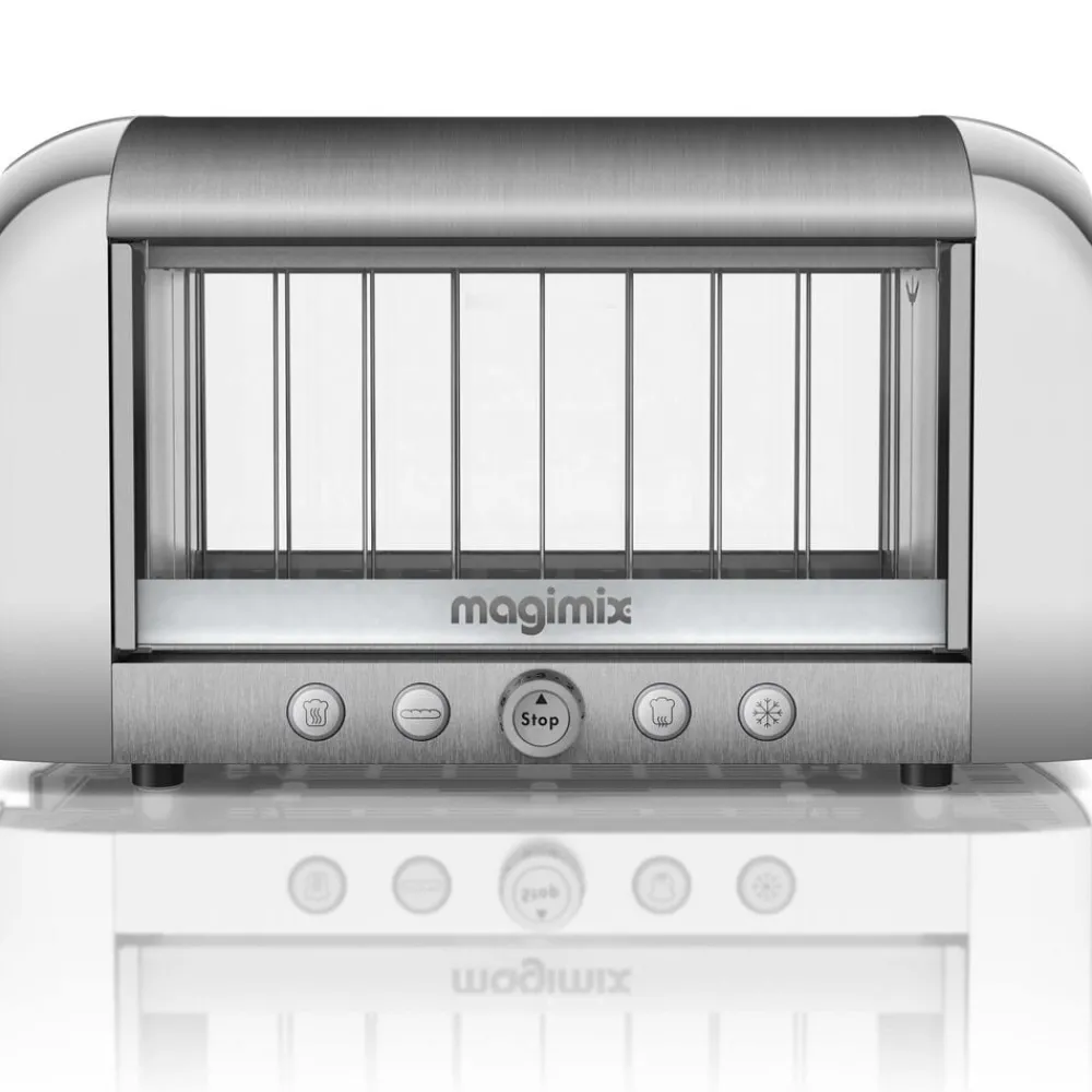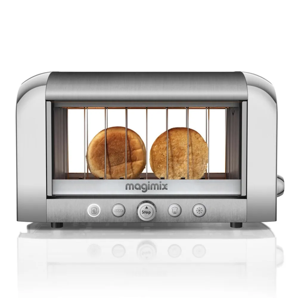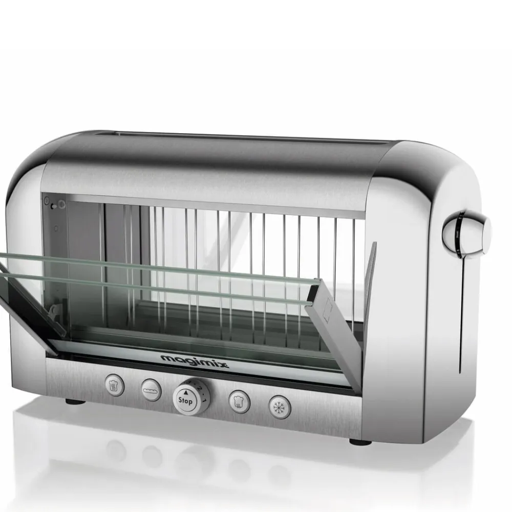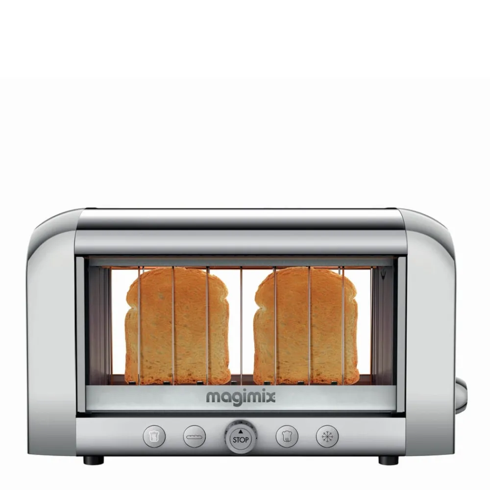 Verdens første gennemsigtige toaster, der gør det nemt at holde øje med brødets ristning. Professionel Magimix toaster, der rister, optør og varmer alle typer af brød bag isolerende dobbeltglas. Enkel at betjene med én knap pr. funktion og med plads til ekstra tykke skiver.