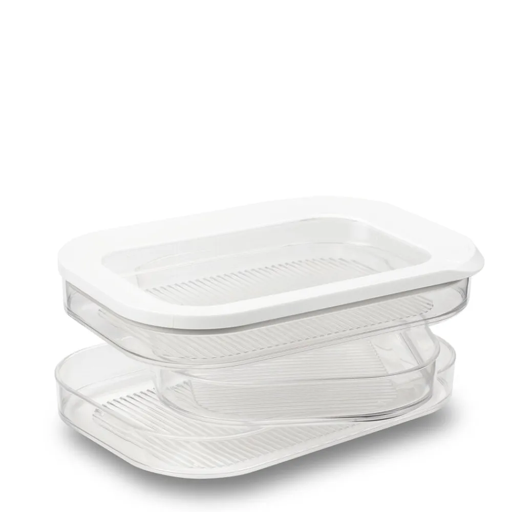 Modula opbevaringsboks med enkel, hvid kant på låget. Både bokse og låg er gennemsigtige, hvilket gør det nemt at overskue indholdet. 3 x 550 ml. Mål: 22,5 x 16 x 8 cm. Boksene er fremstillet af SAN-plast, som er robust og modstandsdygtig overfor ridser. Velegnet til opvaskemaskine men ikke til mikroovn og fryser.