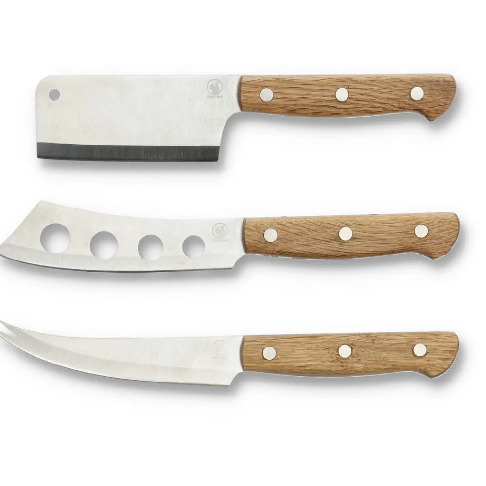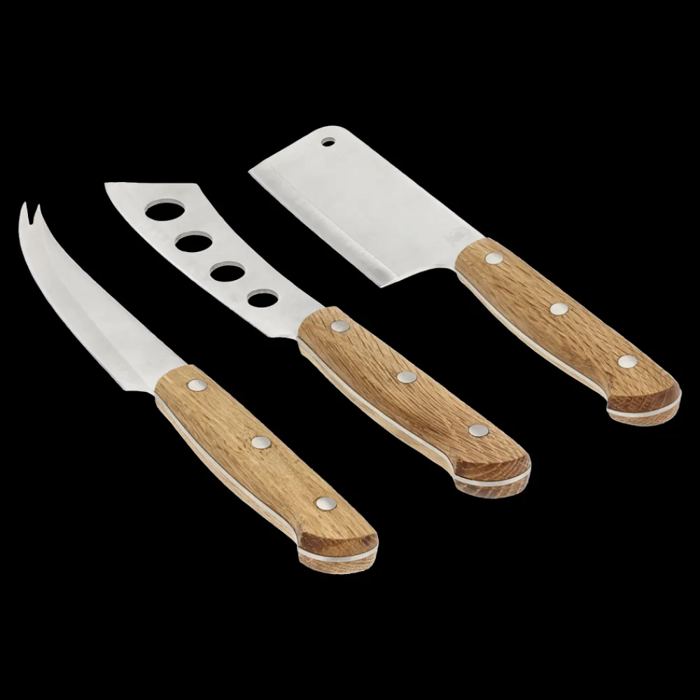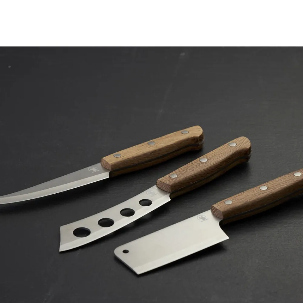 Ostesættet med tre osteknive er det perfekte tilbehør til osteanretningen. Knivbladene er udført i rustfrit kvalitetsstål og håndtagene i olieret eg, som ved brug vil udvikle patina og blot blive smukkere, jo mere knivene bruges. Træhåndtagene er udformet af ét stykke træ og er behagelige at holde om.