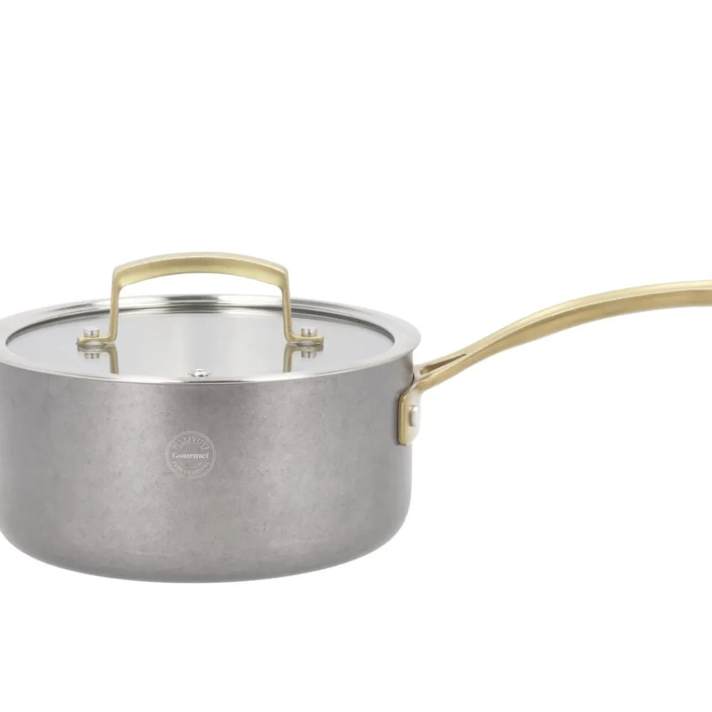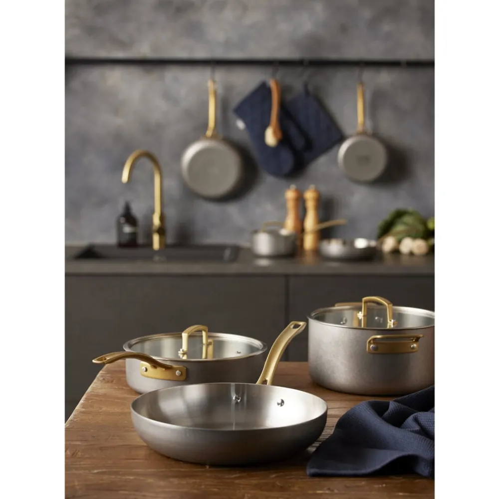 Fremstillet af 18/10 rustfrit stål med en kraftig 2,5 mm 3-lags konstruktion af rustfrit stål, aluminium og rustfrit stål. Mellemlaget af aluminium sikrer optimal varmefordeling. Pånittede støbte stålhåndtag, som er PVD-forgyldt. Ydersiden har en vintage polering. Glaslåg med damphul. Målestreger indvendigt på kasseroller og gryder. Passer til alle varmekilder inkl. induktion. Håndopvask anbefales.