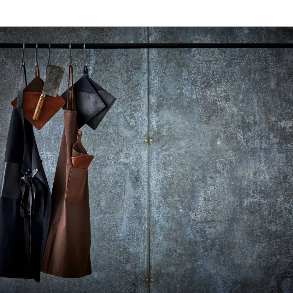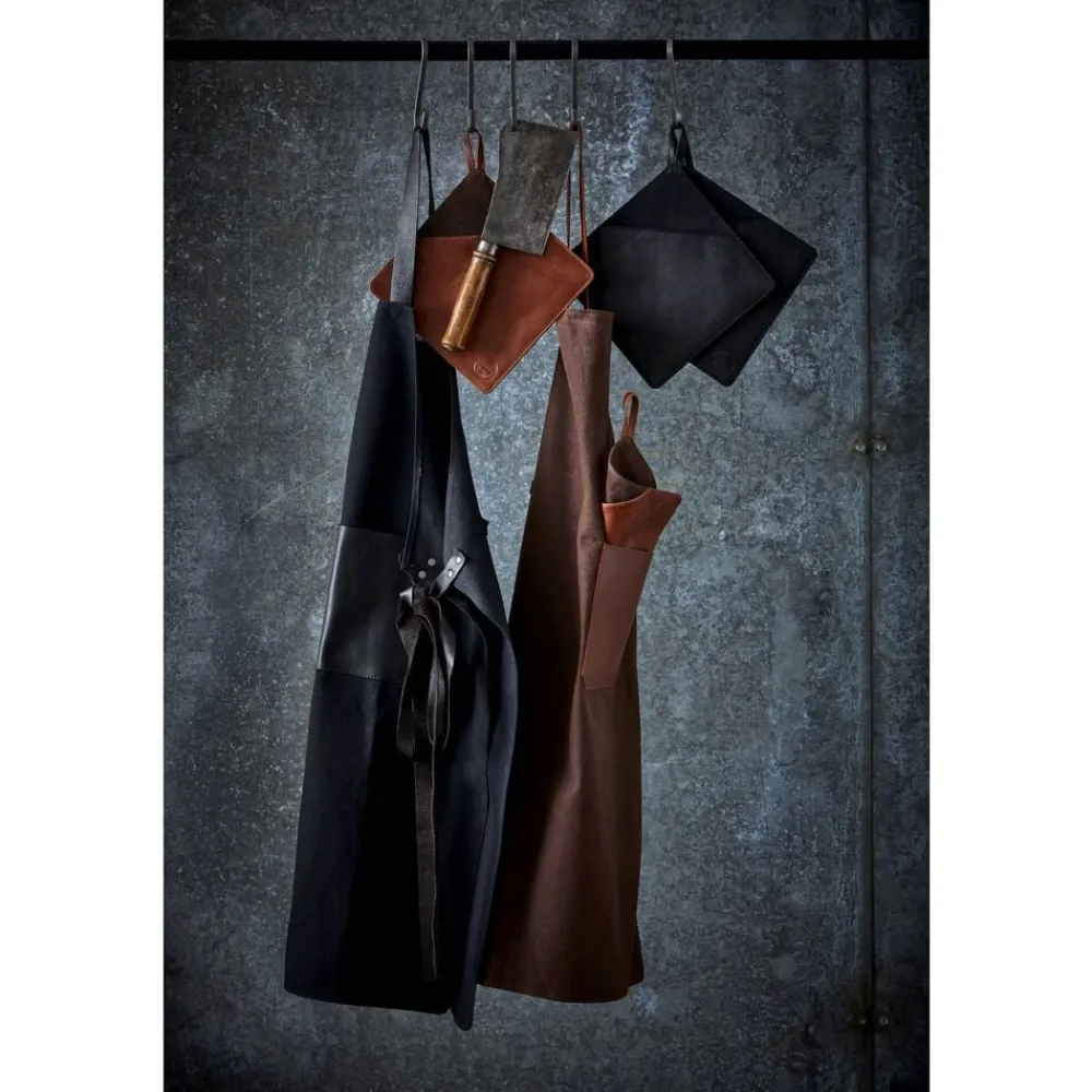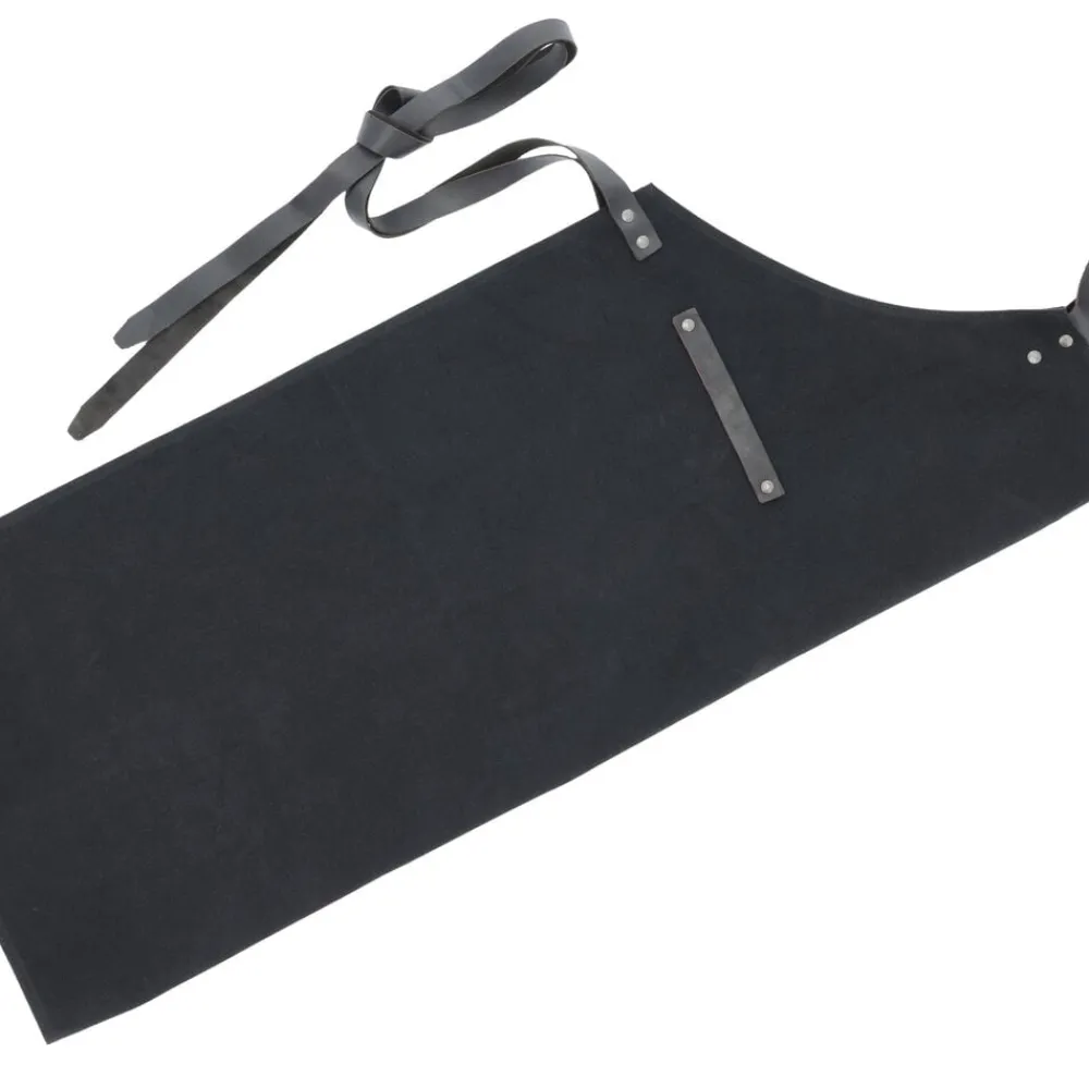 Sort kvalitetsforklæde i vokset kanvas med læderdetaljer. Kanvas er 100 % bomuldsstof i en kraftig vævning. Det er slidstærkt og vandafvisende, hvilket gør det egnet til hverdagsbrug. Det kan let rengøres med en fugtig klud. Læderet er 100 % bøffellæder. Bøffellæder er slidstærkt og har stor elasticitet. Med passende pleje vil bøffellæder holde i lang tid og få patina, som fremhæver læderets skønhed. Forklædet har en praktisk lomme og en strop, hvor viskestykket kan hænge, imens du laver mad. Forklædet kan justeres, så det passer til din højde.