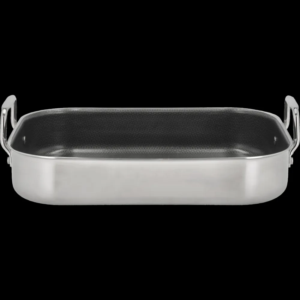 Bradepande, 35 x 25 x 7 cm. De udvendige mål er 39 x 26,5 x 10,6 cm og angiver, hvor meget bradepanden fylder inkl. håndtag. Paillon Hybrid-serien fra Pillivuyt Gourmet er fremstillet i 3-ply rustfrit stål, som er en konstruktion af to lag rustfrit stål med et aluminiumlag imellem. Det betyder, at varmen fordeles hurtigt og fastholdes jævnt. Vær forsigtig ved opvarmning – varm gryder og pander langsomt op og undgå at overophede. Takket være den indvendige keramiske hybridbelægning får du en slidstærk overflade med en effektiv non-stick-effekt. Det forhøjede mønster i rustfrit stål beskytter bunden, mens den keramiske topbelægning sikrer, at maden ikke brænder fast.
