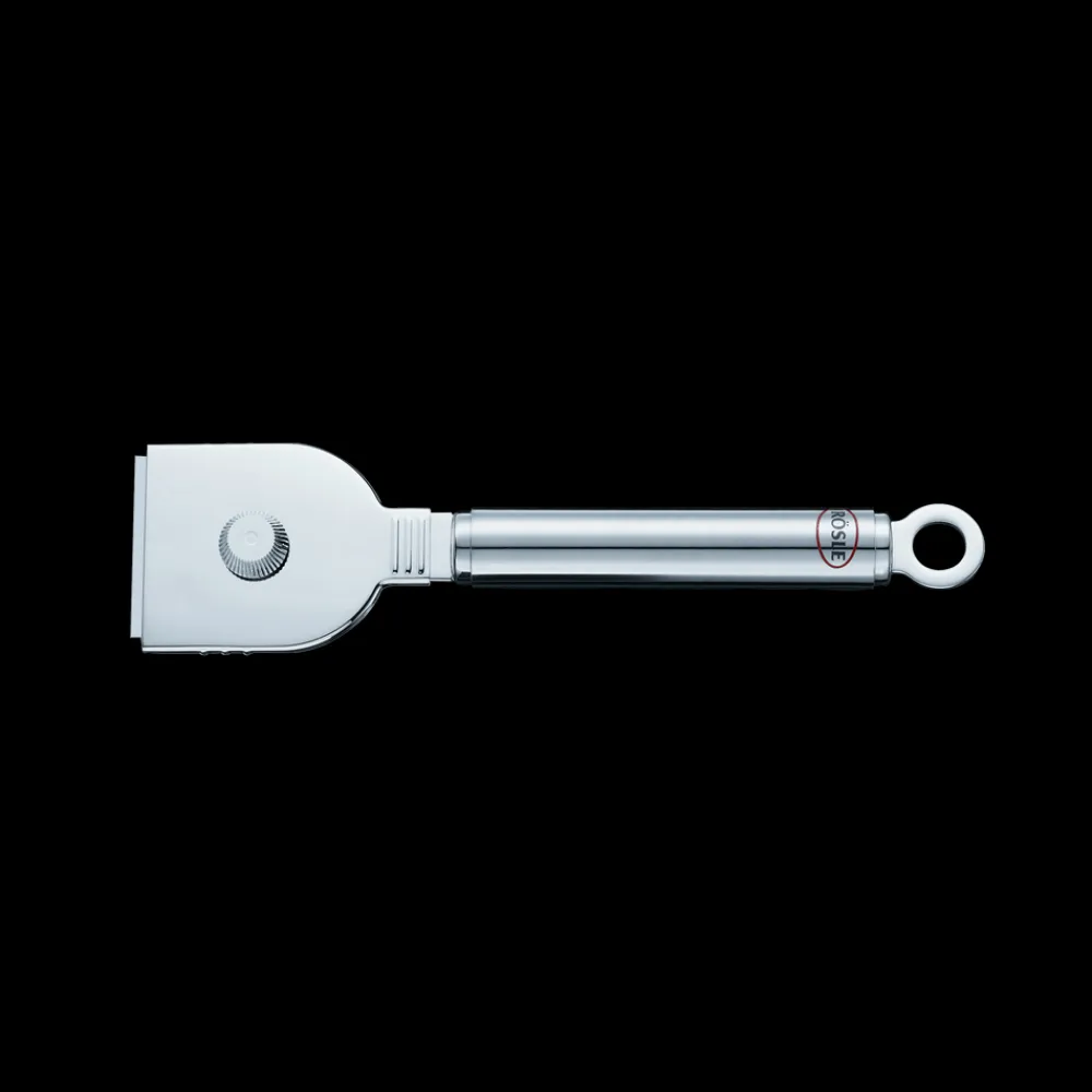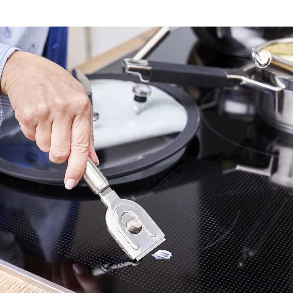 RÖSLE skraberen i rustfrit stål fjerner nemt brændte madrester fra kogepladen. Skraberens blade kan skubbes ind og ud, og sikrer sikker opbevaring i skuffen. Bladene kan udskiftes ved behov.