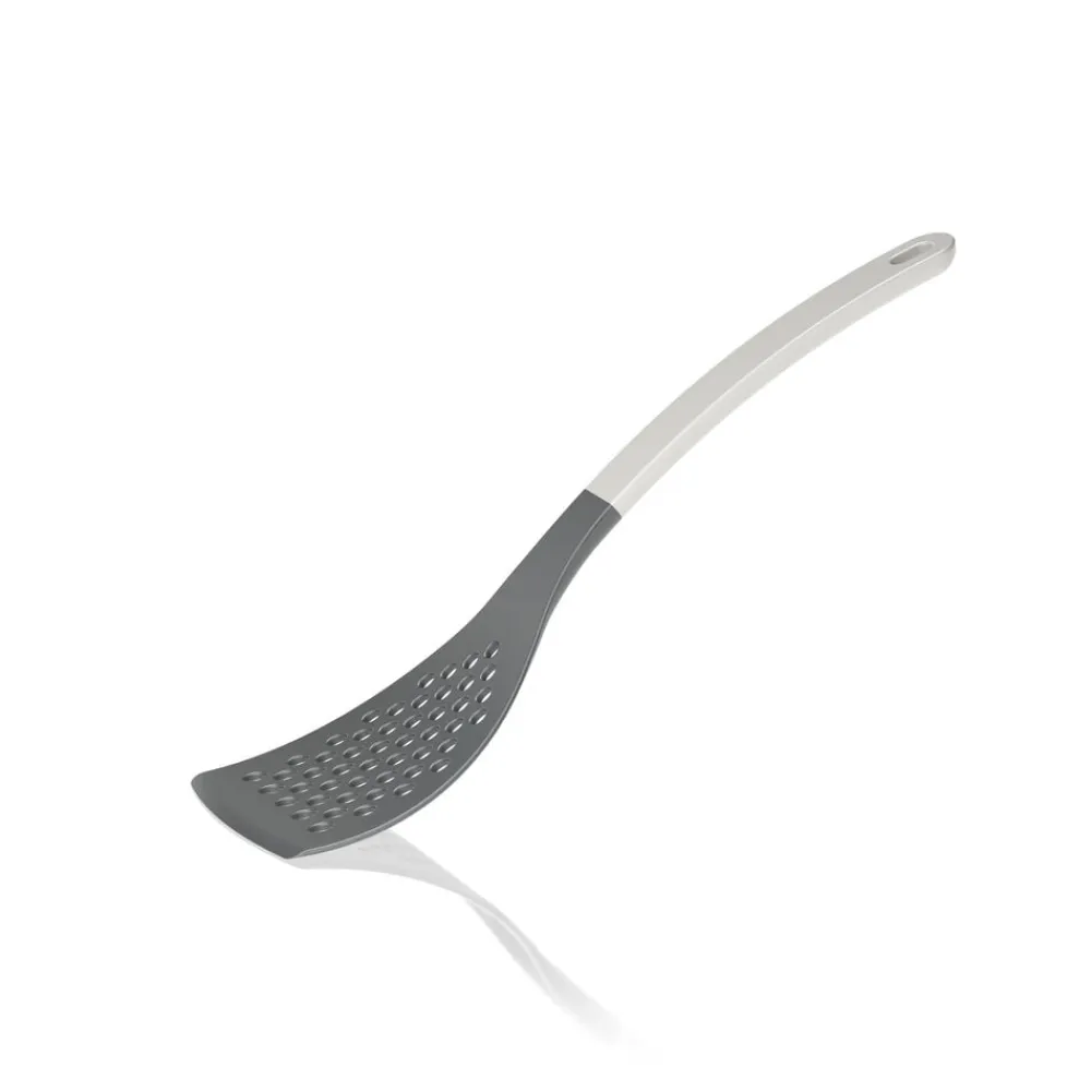 Stor palet med farvet skaft. 31 cm. Bladet er perforeret, og med en bredde på 8,5 cm er paletten velegnet til at håndtere større fødevarer på panden, såvel kød som grøntsager. Fremstillet i nylon, der er skånsomt mod gryder og pander med belægning og tåler varme op til 220 grader C. Slankt og ergonomisk design med praktisk ophængshul. Velegnet til opvaskemaskine.