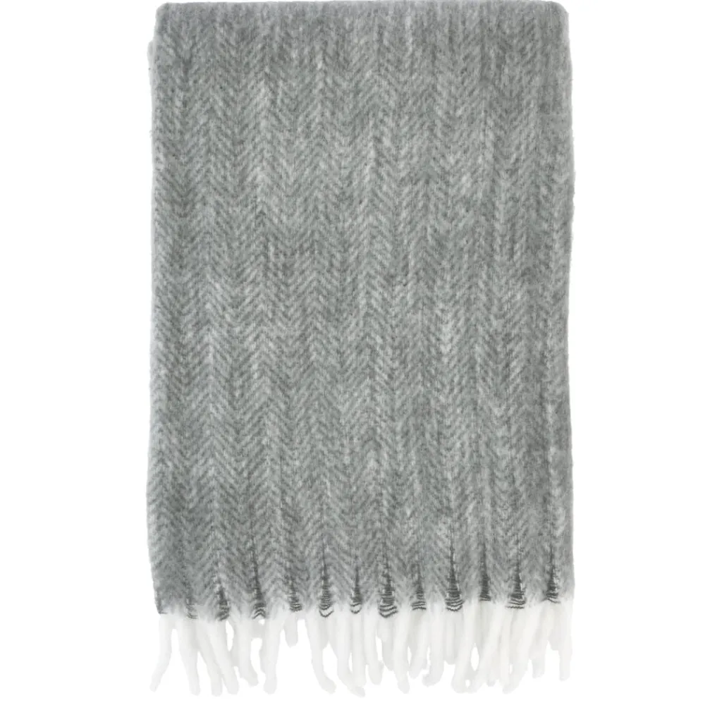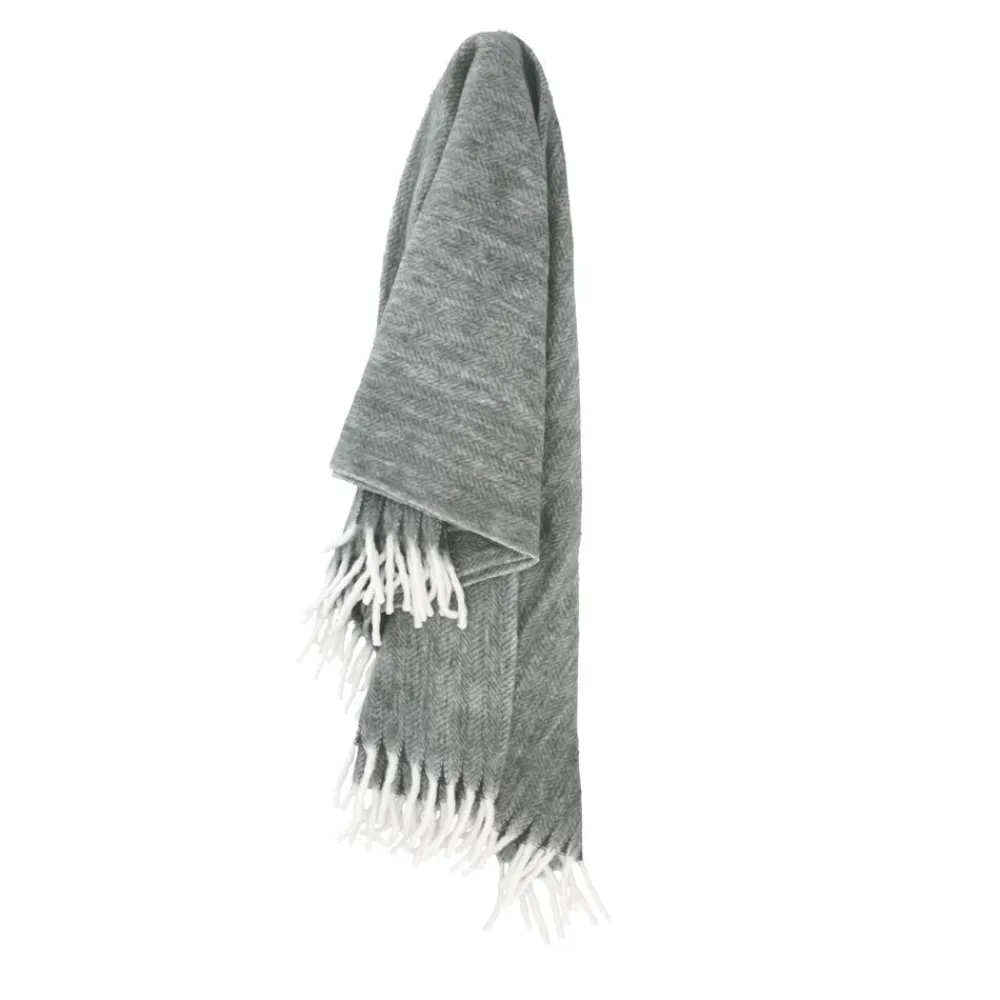 Strikmønstret er et traditionelt, tidløst sildebensmønster. Tæppet er af akryl og ekstra stort, 150 x 200 cm, med lange, tykke frynser i begge ender.