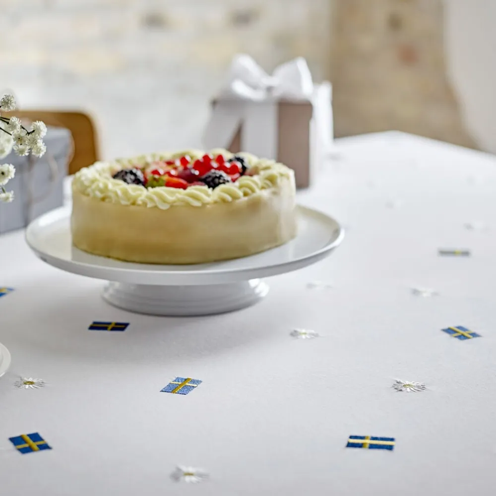 Dugen prydes smukt af svenske flag og fine små margueritter, også kendt som tusindfryd. Dette design er som skabt til at bringe glæde og fejring til enhver lejlighed.