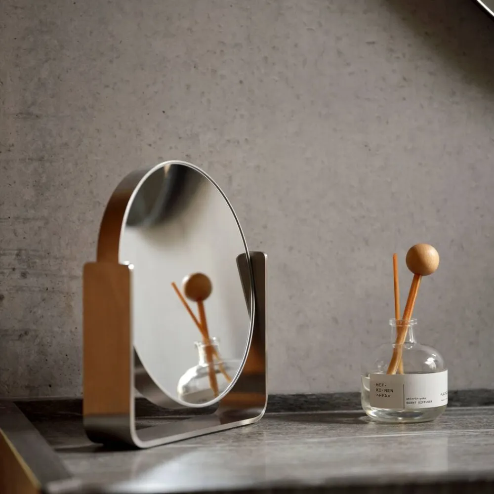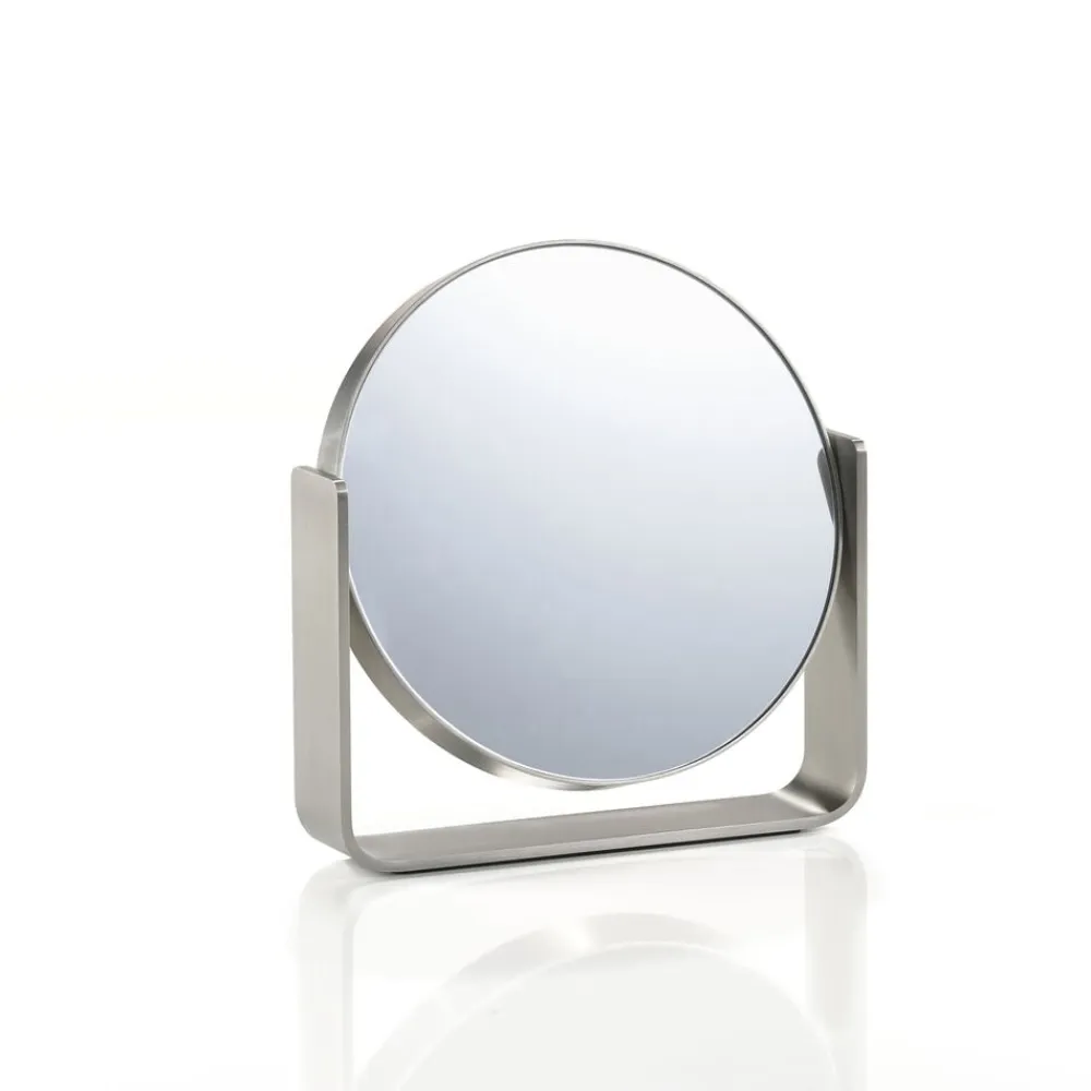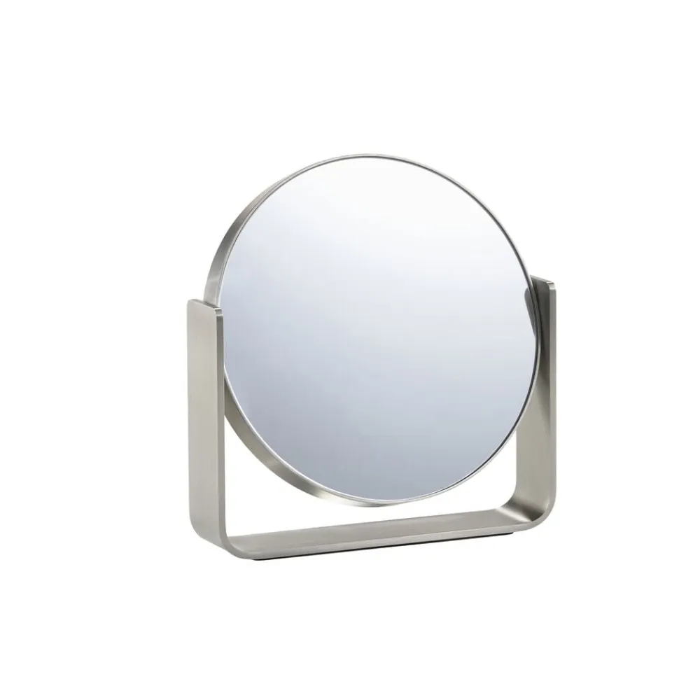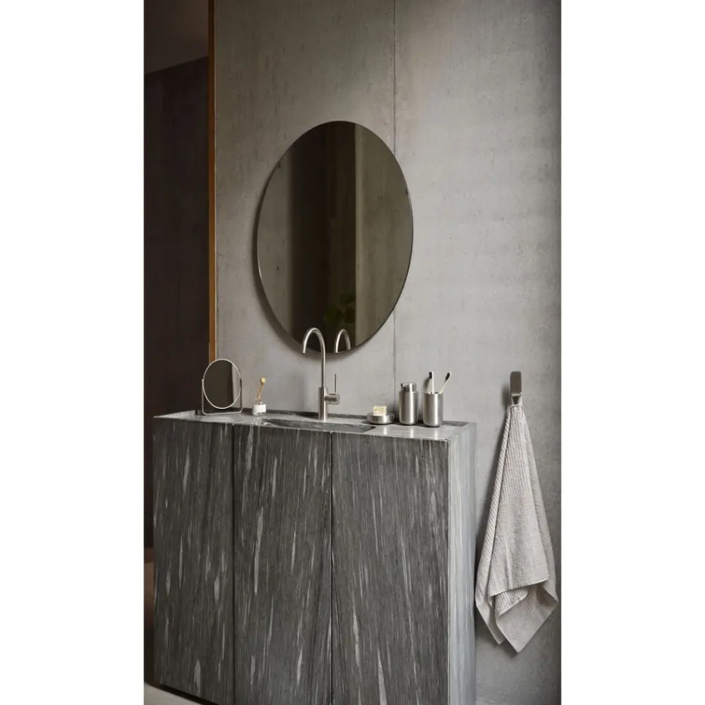 Til bordet findes både sæbedispenser, sæbeskål samt tandbørstekrus samt rundt bordspejl med vippefunktion. På trods af stålets mathed reflekterer lyset sig smukt i overfladen og giver overfladen liv og karaktér. Alt i alt en formfuldendt forvandling af en ægte Zone-klassiker.