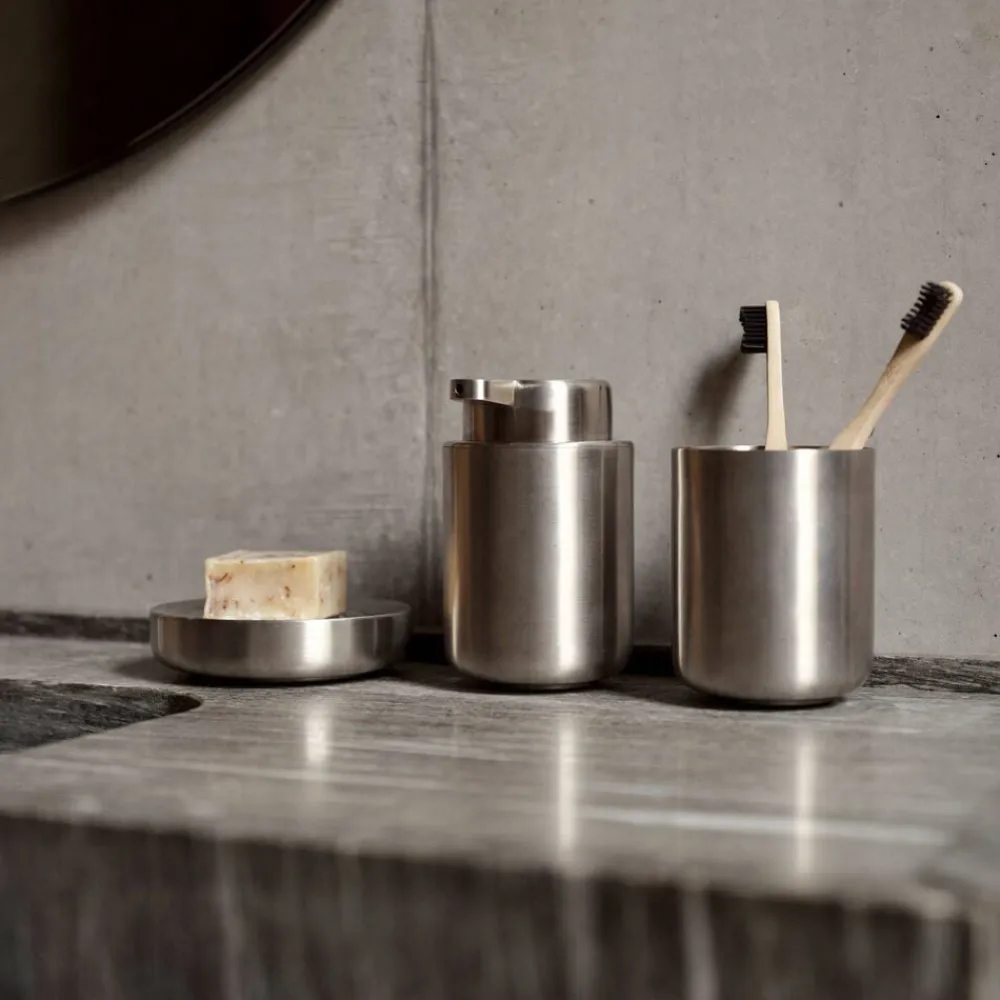 Til bordet findes både sæbedispenser, sæbeskål samt tandbørstekrus samt rundt bordspejl med vippefunktion. På trods af stålets mathed reflekterer lyset sig smukt i overfladen og giver overfladen liv og karaktér. Alt i alt en formfuldendt forvandling af en ægte Zone-klassiker.