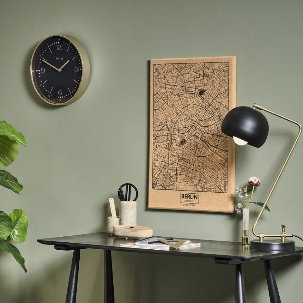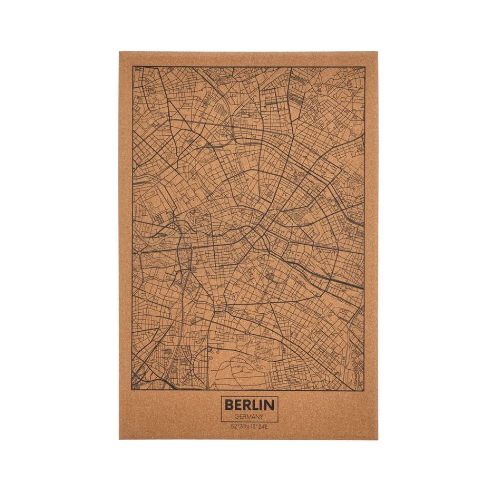 Bykort med Berlins vejnet på korkplade uden ramme.