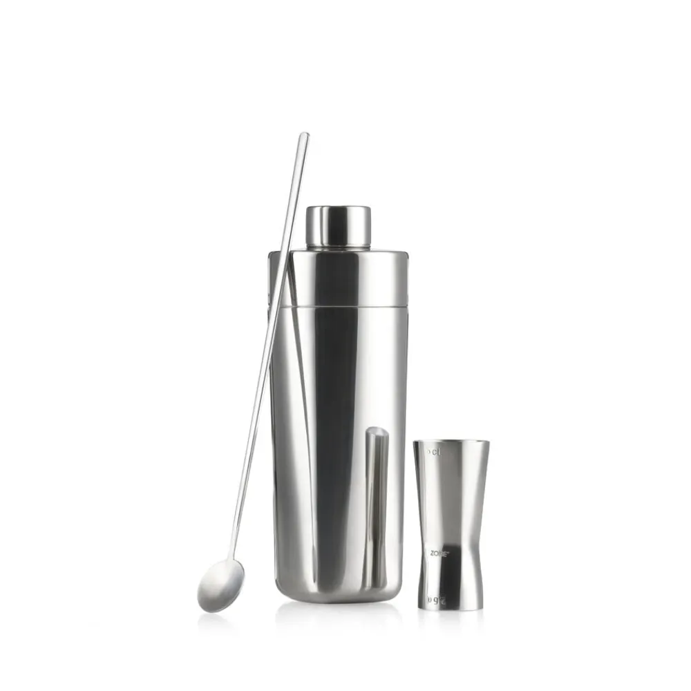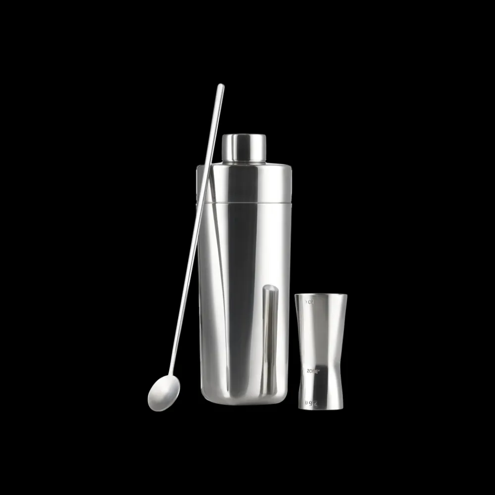 Barsættet består af Rocks shaker 400 ml, målebæger 2,5/5 cl og cocktailske i rustfrit stål.