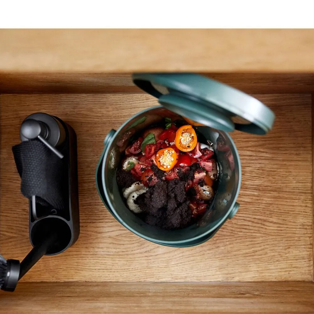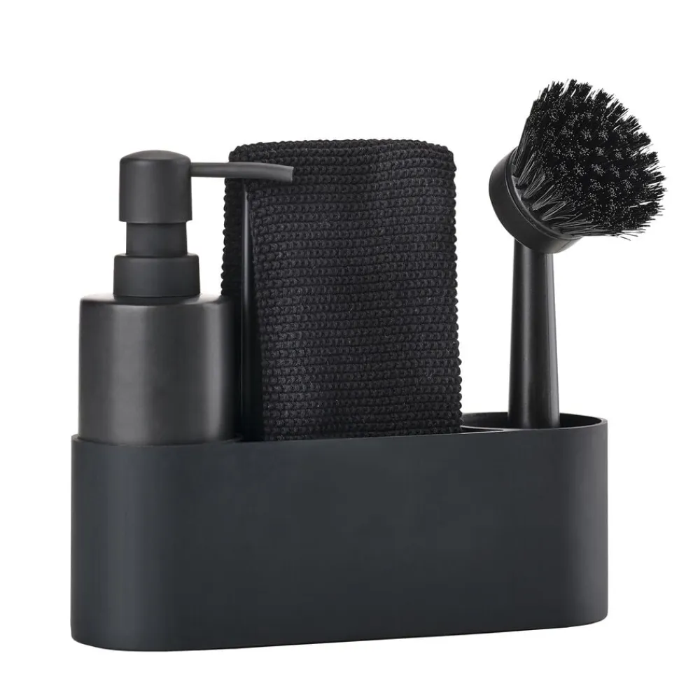 Rummet i midten af opvaskesættet kan eksempelvis indeholde skuresvamp og klud, mens metalbøjlen er både en praktisk hank og et glimrende tørrestativ for kluden.